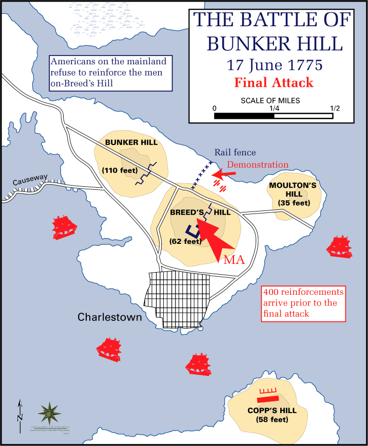 - Unless otherwise noted, information in the section was found in Victor Brooks, The Boston Campaign April 1775- March 1776 (Conshocken, PA: Combined Publishing, 1999), 141-178; Richard M. Ketchum, Decisive Day: The Battle for Bunker Hill (New York: American Heritage Publishing, 1962), 137-83; Paul Lockhart, The Whites of the Eyes: Bunker Hill, The First American Army and the Emergence of George Washington (New York: Harper Collins, 2011), 239-304; James L. Nelson, With Fire and Sword: The Battle of Bunker Hill and the Beginning of the American Revolution (New York: St. Martin Press, 2011), 217-304; Nathaniel Philbrick, Bunker Hill: A City, A Siege, A Revolution (New York: Penguin, 2013), 188-229. ↩︎