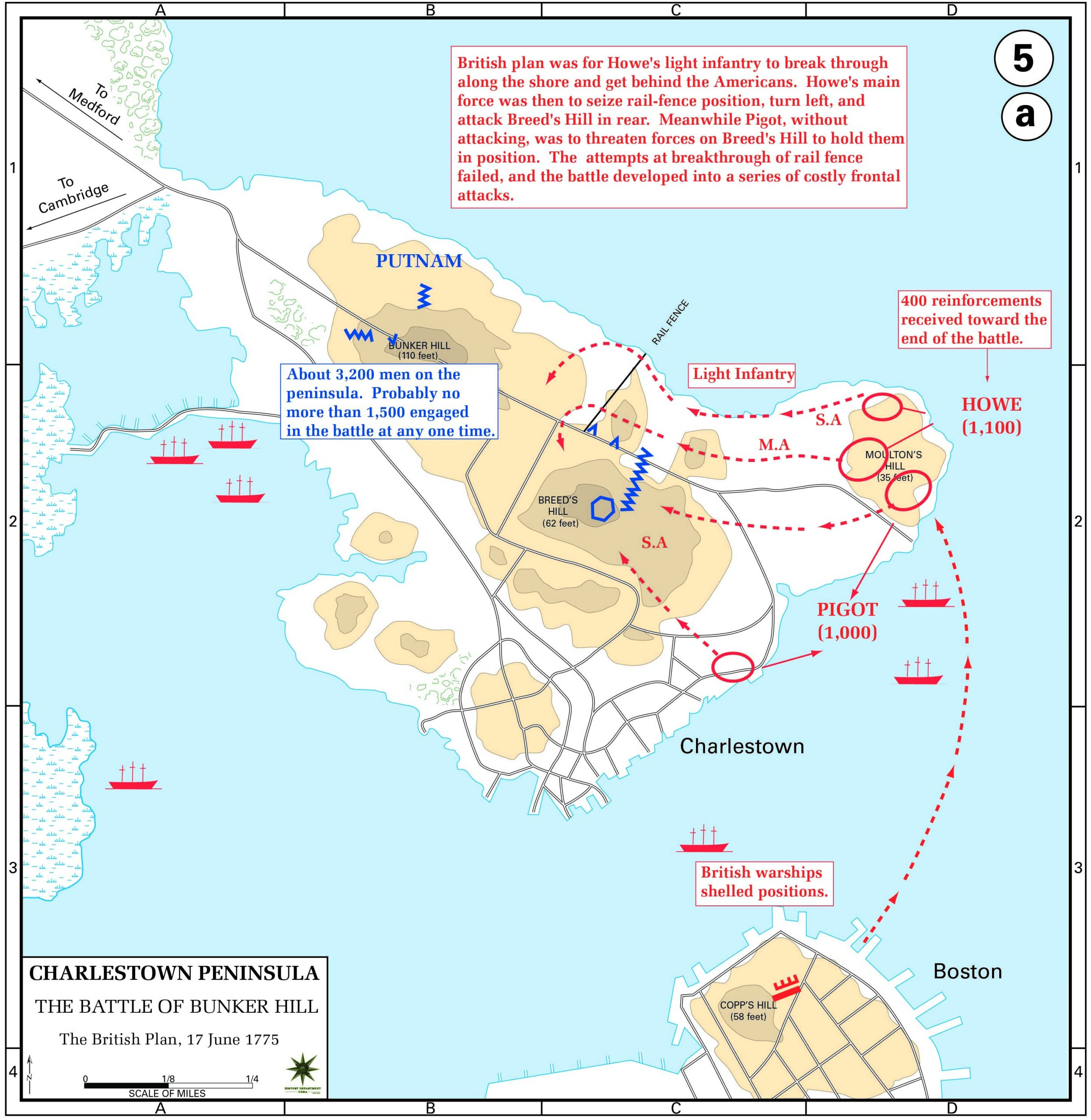 Following the battles of Lexington and Concord, General Gage received reinforcements that increased his strength to about 7,000 men, not counting the crews of the Royal Navy warships in Boston Harbor. Three major generals, William Howe, Henry Clinton, and John Burgoyne, also arrived to assist Gage and command the three divisions of the British Army at Boston. More aggressive than the overly cautious commander-in-chief, Gage’s three new subordinate general officers recognized the need for British troops to push the rebel forces that had surrounded the city back to a less threatening distance as soon as possible. They proposed a plan for a two-pronged offensive in which one force would land at Charlestown and advance to capture the New England Army of Observation’s headquarters and principal supply magazines at Cambridge, while another attacked rebel positions at Roxbury and Dorchester Neck. Once British forces ruptured the provincials’ siege lines, both wings would advance to trap the remaining rebels in a giant pincer movement.3