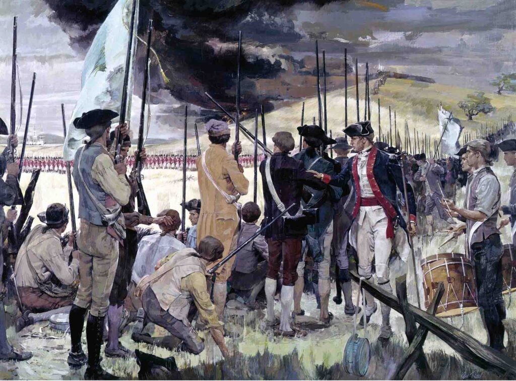 The redcoats advanced over fields where the high grass was now trampled down, blood-stained, and littered with dead and dying comrades. The Americans, now low on ammunition, fired and again exacted a toll on the redcoats. Although their artillery failed to breach the American earthworks, British officers urged the redcoats to push forward. Despite the heavy American musketry, British troops finally began to reach the entrenchments, close enough to use their bayonets, and fighting became hand-to-hand. Pigot’s brigade on the left swung around the west to outflank the redoubt. The British marines came under heavy fire and halted to return fire instead of charging the entrenchments. Major John Pitcairn was attempting to rally the marines of his battalion when he was shot and killed. According to tradition, a Patriot of color named Peter Salem fired the fatal shot. The 47th Regiment formed on the left of the stalled marines, which allowed them to re-form and resume their advance with the bayonet.